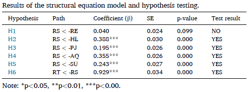 该模型是以顾客满意度指数(CSI)为基础,从居民期望值(RE)、供暖水平(HL)、公平认可(PL)、空气质量(AQ)、补贴数额(SU)、居民满意值(RS)居民对政策信任度(RT)七个因素出发,构建了居民满意度模型(RSM)。通过调查居民对这七个因素的评分(1-5分),评估居民整体满意度,随后采用结构方程模型(SEM)分析了居民满意值(RS)和各个因素的关系。