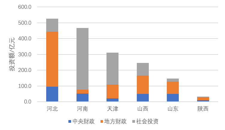 2017年至2019年,重点地区(天津市、河北省、河南省、山西省、山东省、陕西省)清洁取暖资金投入约1731.5亿元,其中各级财政资金合计投入占55%,社会资金投入占45%。大部分省份以财政资金投入为主,占比高达67.6%~88.6%,未来各地应大力推进绿色金融,带动企业投入(图3)。如河南省通过探索绿色信贷、绿色资产证券化和绿色基金等机制,有效带动了社会资本投入。